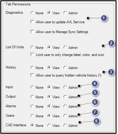 This section controls the permissions available to the User on the CAD Interface Tab. None: If selected, the User will not have access to this tab. View: If selected, the User will have view only access to this tab. Admin: If selected, the User will have access to all available tools and may make alterations on this tab. |