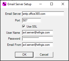 In order to send emails to the appropriate staff when alarms are triggered, an email server system will need to be configured. This section is typically set up at the time of server deployment, by or with WTH assistance, and not modified unless coordinated. WTH offers a default option that provides email alerts sent from avl.server@wthgis.com. If alarms must come from a department-specific email server, then these steps may be referenced for configuration assistance. Follow these steps to enable this function: