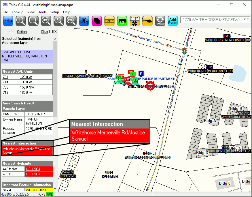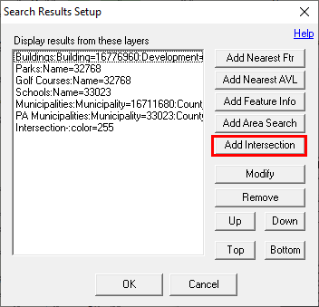 This option will highlight the centerline intersection that is nearest to the feature located via a lookup from the Search Box. This result will be listed in the Information Window. Follow these steps to set it up: