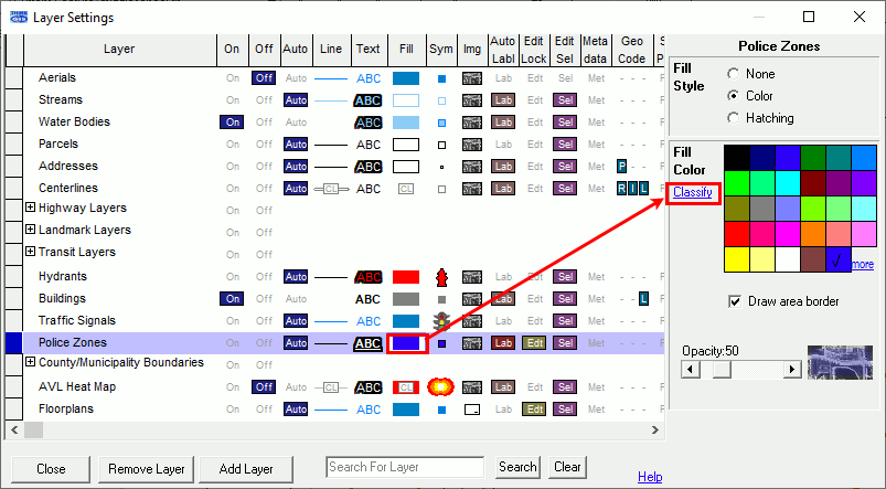 1) As in setting any layer attribute in the Layer Settings, first select the layer and the entity type in the Layer Settings window. In the entity type window (In this example, the fill column.), click "Classify."