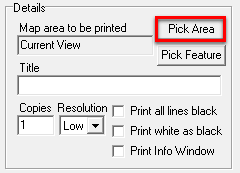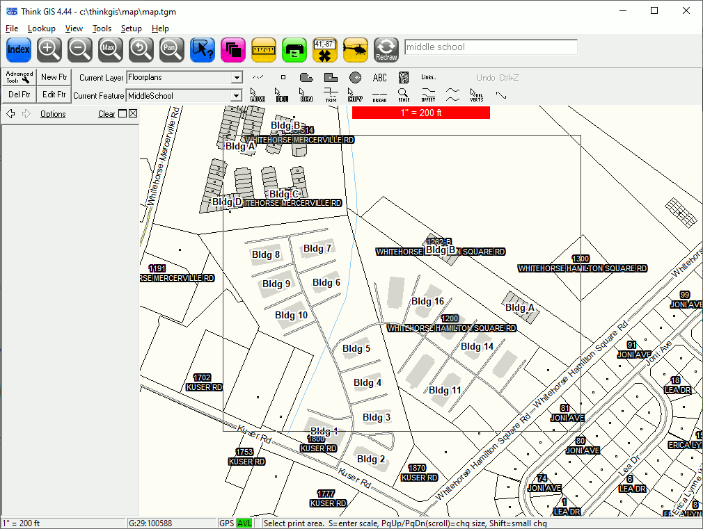 Click on the Think GIS display indicating the location and scale of the printout when prompted. Once the correct area and scale are set, left clicking will return the user to the print window with the newly selected area displayed.