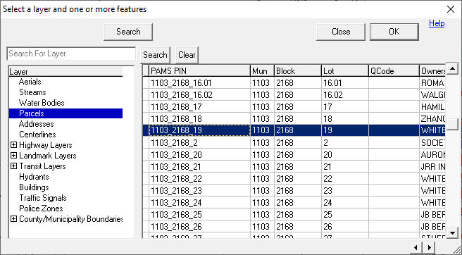 Click Browse to select a feature to print from the Feature Select window. Use the shift or Control keys to select multiple features on the same layer. Users can also use a search option to select multiple features matching a certain criteria. When multiple features are selected, Think GIS will create a separate printout for each feature. Once the feature(s) is selected, click OK to return to the Pick Feature setup window.
