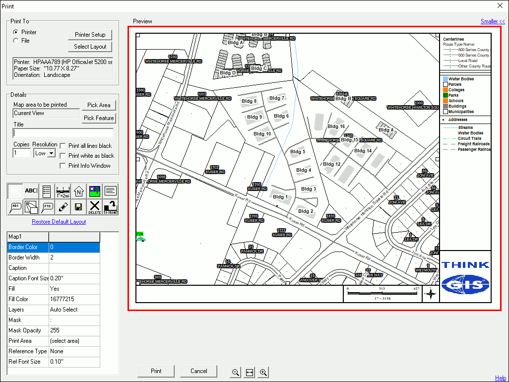 This window displays what the print will look like. When viewing full screen (click View/Edit Layout), users can select any graphic on the page to change its properties or location. All graphic positions snap to the nearest 1/10th of an inch.