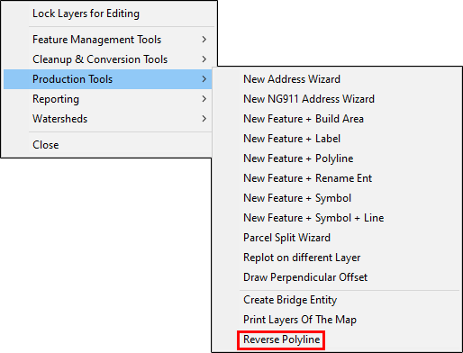 Some layers, reporting functions, and tools require that polylines be drawn in a consistent direction. In the case of utilities, this would be the direction of travel for the type of utility, ie, water lines. For address ranges, this would be the direction of travel from the median line. Step-by-step instructions for the Reverse Polylines tool, located on Tools Menu > Show Map Editing Tools > Advanced Tools > Production Tools, below: