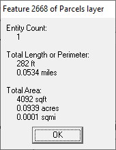 The Feature Statistics window calculates and displays the total length and area of a Feature. Total length is calculated as the sum of the length of all polyline Entities and the perimeter of all area Entities belonging to this Feature. Total area is simply the sum of the area of all area entities belonging to this Feature. Each total is redundantly displayed using different units.