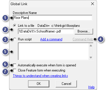 The most common type of Global Link is to open a file. The Browse... button allows the user to browse to the desired file and automatically populates the Link to a file section with the correct values for a single file. It is possible to setup a single link that works differently for each feature by using field values as part of the filename or path. Use <> brackets to insert the field into the path or filename. Example: <SchoolName>.pdf |