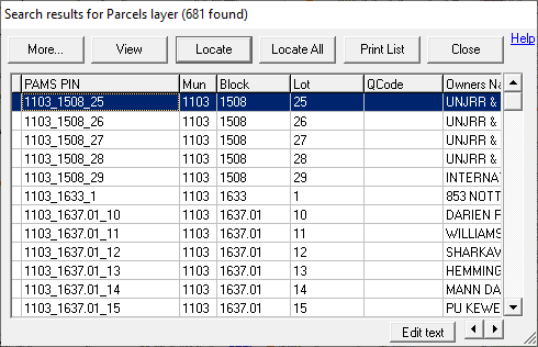 5) A search results window will appear like the one below listing all of the Features on the selected layer that are located within the specified distance of the base Feature.