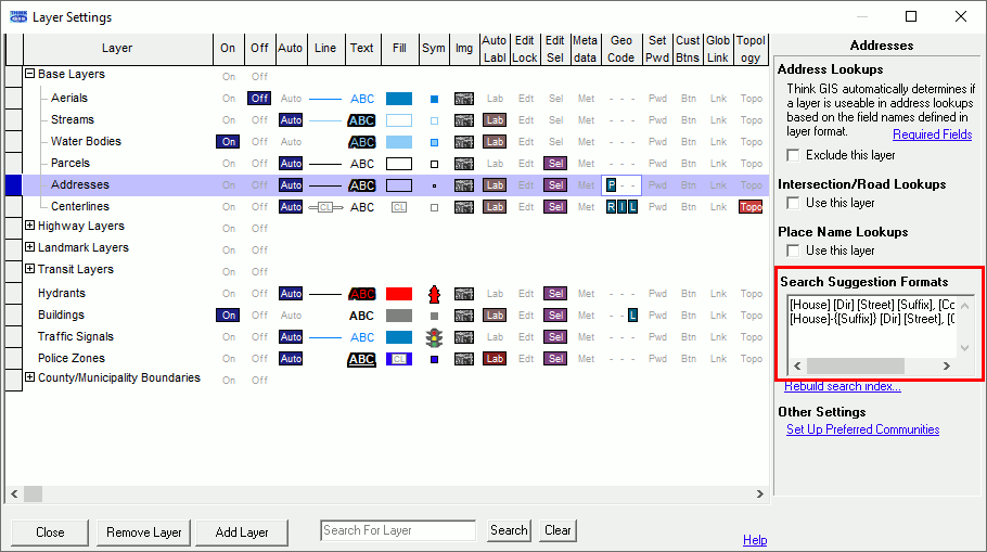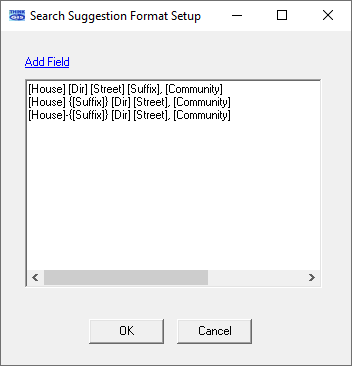 Search Suggestion Formats Click in this box and a pop-up window will appear. In this window users may specify if and how a layer should be included in the Search Suggestions Index. To include the contents of this layer in the Search Suggestions index, enter one or more formats here specifying how each feature should get included. Each line of this window specifies one way (aka "format") that the features on this layer are commonly identified. Each format line consists of one or more field names contained in square brackets along with any optional literal text inserted before, between, or after the fields.
