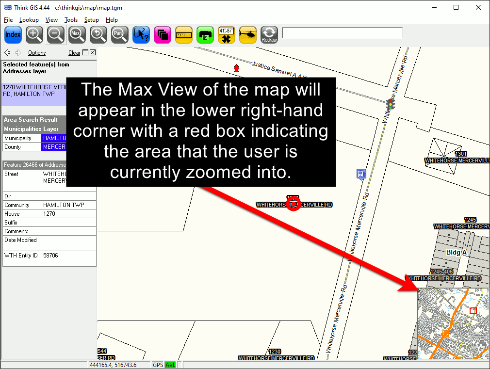The Birds Eye window, when enabled, displays a small map insert window in the bottom right corner of the Think GIS display. This window shows a "Max View" picture of the entire map along with a white rectangle indicating the portion of the map being viewed in the main display. To Show the Birds eye window click "Show Birdseye window" on the View menu.