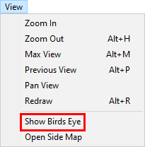 The Birds Eye window always displays a picture of the map taken at Max View. If a Max View has never been set, or to change it, Zoom to the desired Max View level, go to Setup > Map Settings, and then click the Set button next to the words "Max View".