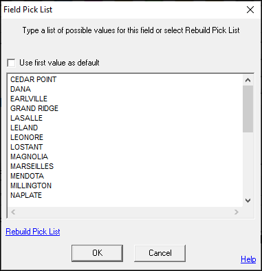 The setup for Pick List (Basic) is detailed below. Unlike the Advanced option, the Basic option will allow users to manually input a value not in the list. See Rebuild Pick List for details on the rebuild window breakdown and description.
