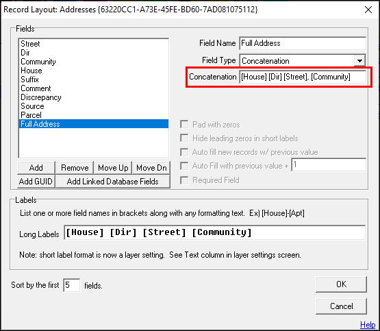 This feature allows users to combine the contents of other fields into one. EX., In an address layer it would be possible to combine the House, Dir, Street, and Community fields into one field as the full address.