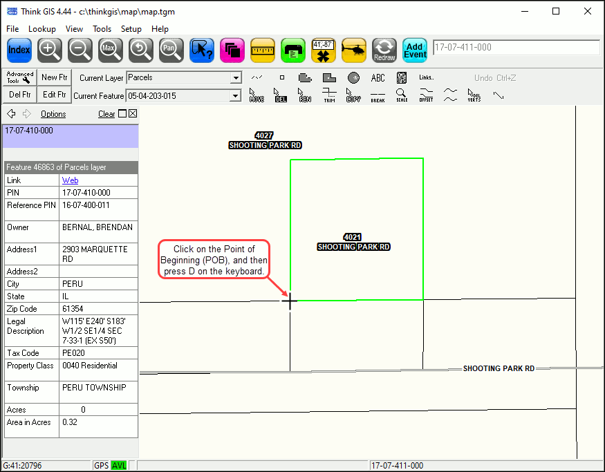3) Place the cursor over the Point of Beginning (POB), left-click and leave the cursor on the POB, and then press D on the keyboard.
