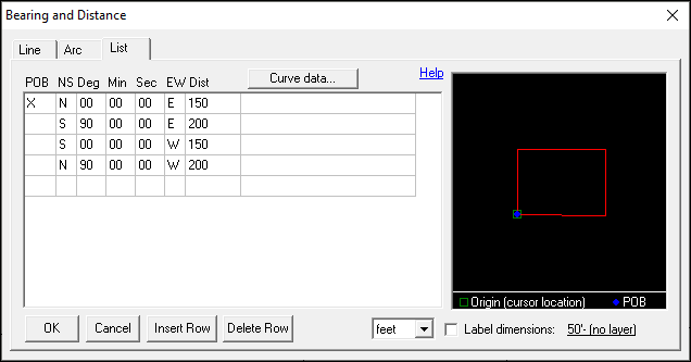 4) The Bearing and Distance tool will pop up. Fill in the calls from the deed and then click OK: