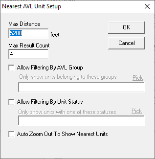 6) If AVL units are assigned to specific AVL Groups, search results may be restricted to a specific group by selecting that group using the "Pick" option to the upper right of the Allow Filtering By AVL Group window.