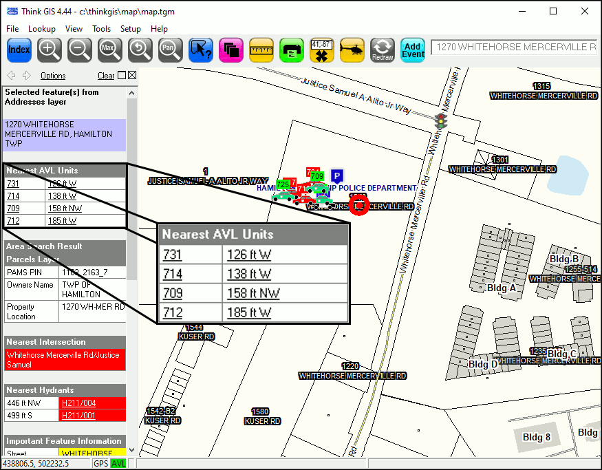 This option will pull up AVL Unit(s) nearest to the feature that has been located via a lookup from the Search Box. Follow these steps to set it up:
