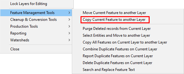Use this menu item, located on Tools Menu > Show Map Editing Tools > Advanced Tools > Feature Management Tools, to copy a feature record and all its child entities from one layer to another.