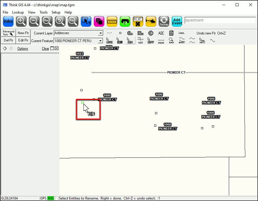 This wizard automates the Rename Ent tool, located on Tools Menu > Show Map Editing Tools > Advanced Tools > Production Tools, by combining it with the New Ftr button to form a single procedure. In the below example, this tool is being used to add suffixes to a series of address points on an apartment complex.
