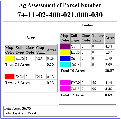 This report breaks down the selected parcel into cells of unique soil type and land use. It calculates and reports the acreage of each cell. Crop and Timber values for each cell are calculated based on productivity factors. The report is organized similarly to a South Carolina Ag Assessment card.