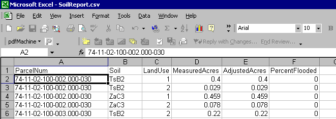 Generic Report format used to generate a comma delimited file listing the soil/land use break down of multiple parcels assessed all at once. When running this report, users can choose to assess all parcels or just those parcels that match a certain criteria such as all parcels in a certain section, or tax district. For batch reports, any geometry errors are logged to a file. Report file name is SoilReport.csv