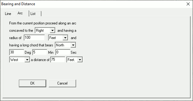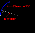 "... then proceed along an arc concaved to the right having a radius of 100 feet and having a chord that bears north 30 degrees 5 minutes east a distance of 75 feet ..."